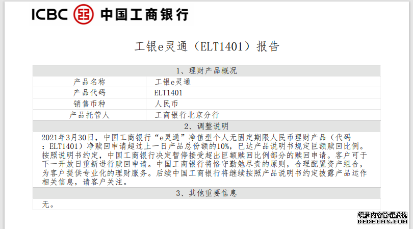 您好,您于2021年4月1日向温州市政服务热线反映其使用手机中国工商银行APP在2021年3月31日因需用钱通过手机app、网上银行办理该理财产品的赎回,但是均无法操作成功。经我行个人金额业务部调查核实,现调查核实情况如下:一、调查情况:中国工商银行“e灵通”净值型个人无固定期限人民币理财产品代码:ELT1401)说明书中第五点,关于巨额赎回,单个开放日中,本产品的产品份额净赎回申请(赎回申请总份额扣除购买总份额后的余额,下同)之和超过上一日产品总份额的10%,为巨额赎回。出现巨额赎回时,工商银行可不接受超出部分的赎回申请,但客户可于下一开放日重新进行赎回申请。理财产品连续两个开放日(含)以上发生巨额赎回,工商银行可暂停接受客户的申购和赎回申请。我行在2021年3月31日信息披露也有公示。二、答复意见:2021年4月7日下午16:18联系客户座机致电客户,向客户解释了我行产品说明书中第五点,关于巨额赎回的条款。