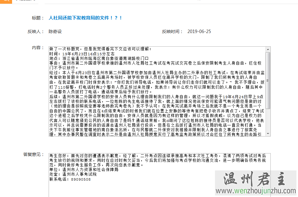 6月23日(周日)温州市第二外国语学校承接温州市人事社保局组织的2019年度国家社会工作者职业水平考试。学校组织程序合理,并不存在限制人身自由的情况。