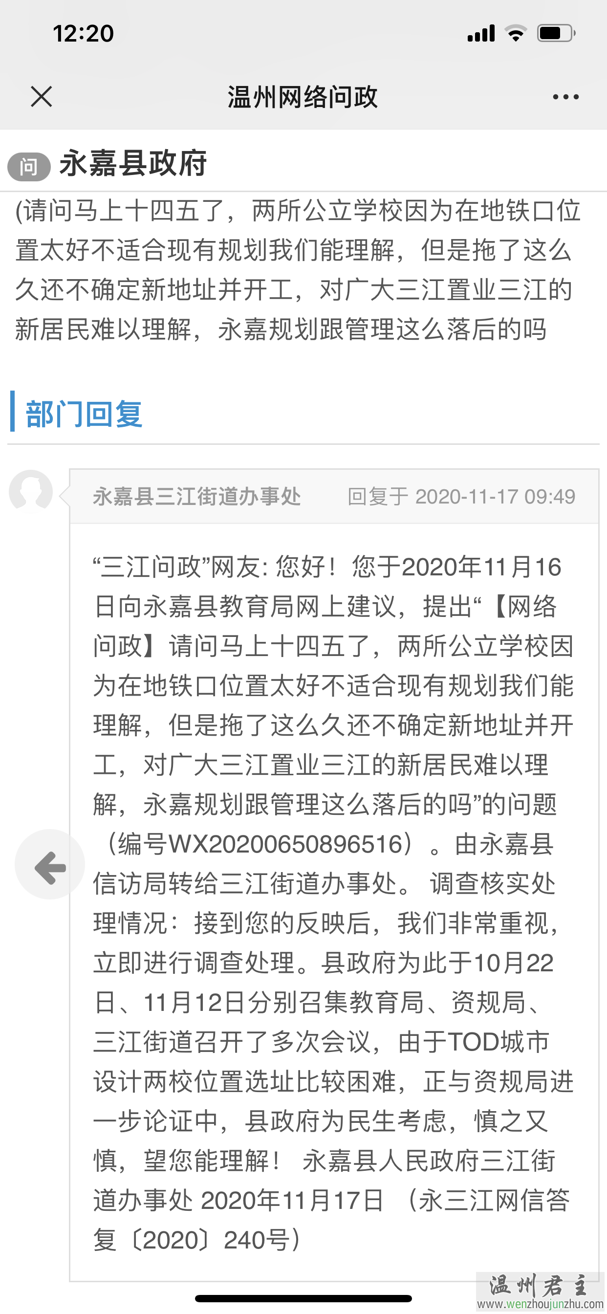 永嘉县三江街道办事处答复:
